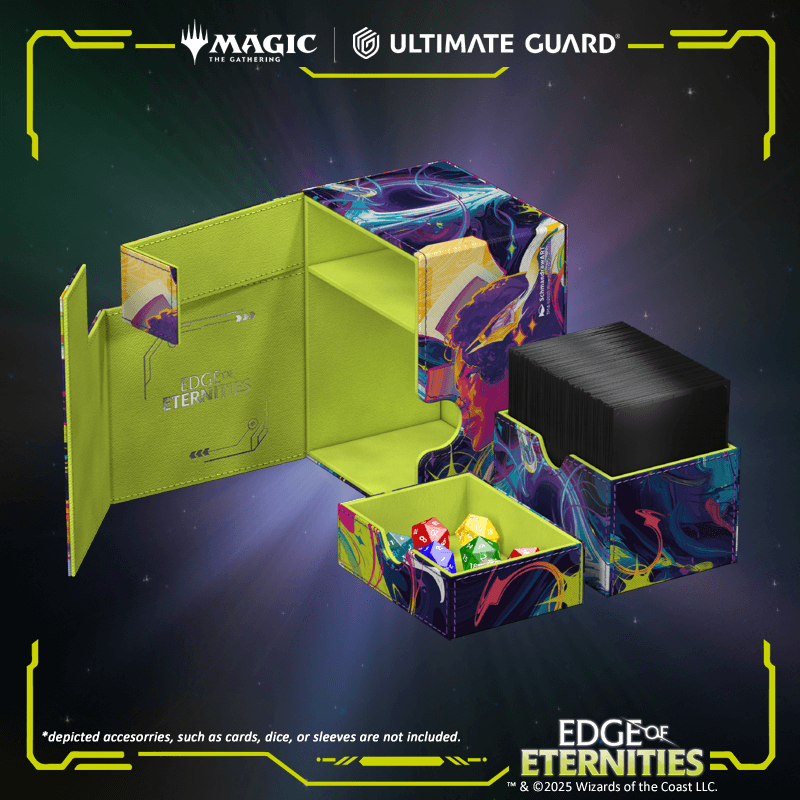 Ultimate Guard's Flip'n'Tray 133+ Xenoskin meets officially licensed artwork from Magic: The Gathering for the first time: The "Edge of Eternities"-style deck box, Haliya and Tezzeret illustrated by SchmandrewART, made of full-color printed, resistant Xenoskin material, not only offers space for 133 double-sleeved cards in Ultimate Guard sleeves, but also an integrated and removable dice tray. The Flip'n'Tray 133+ Xenoskin is the perfect deckbox for Commander/EDH decks and features reliable and strong magnetic closures for safe storage of cards and accessories.